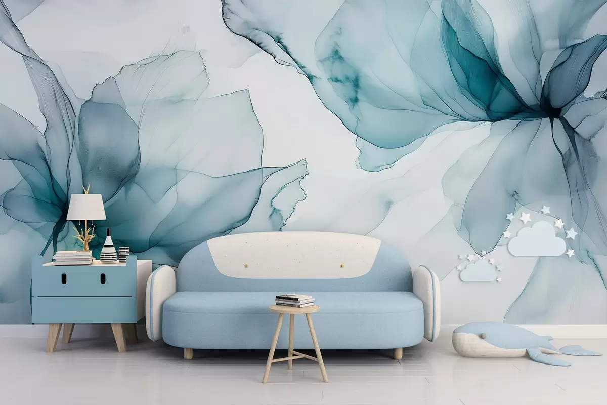 Fototapetes Plūstošā stila ziedi, ziedu abstrakcija, akvarelis, zila krāsu palete Nr. w03406v2
