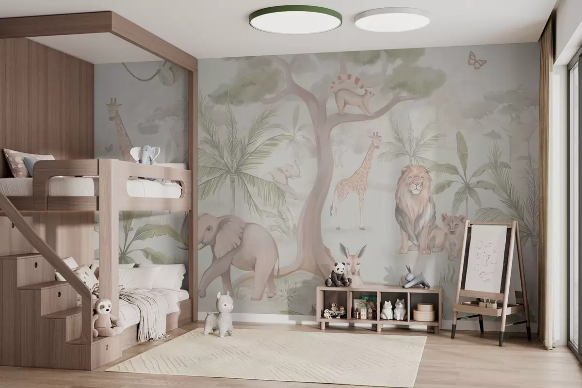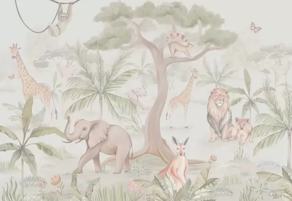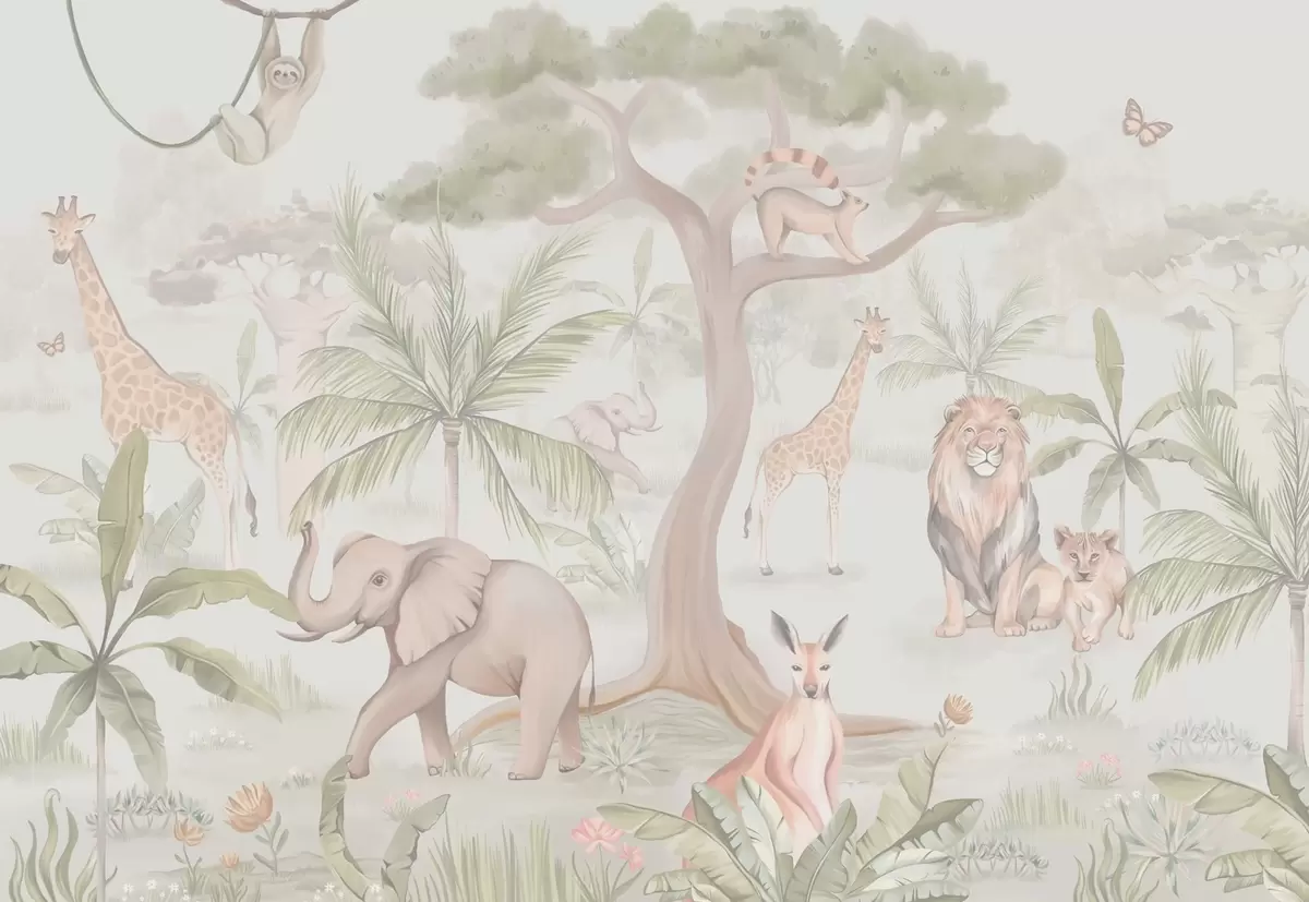 Fototapetes Džungļu panorāma ar dzīvniekiem gaišās krāsās Nr. w03444v1