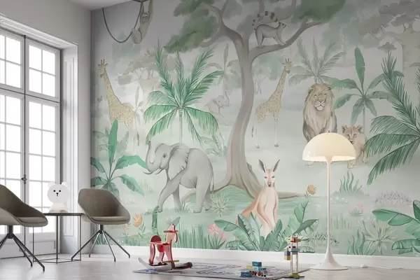 Fototapetes Džungļu panorāma ar dzīvniekiem zaļos toņos Nr. w03444v2