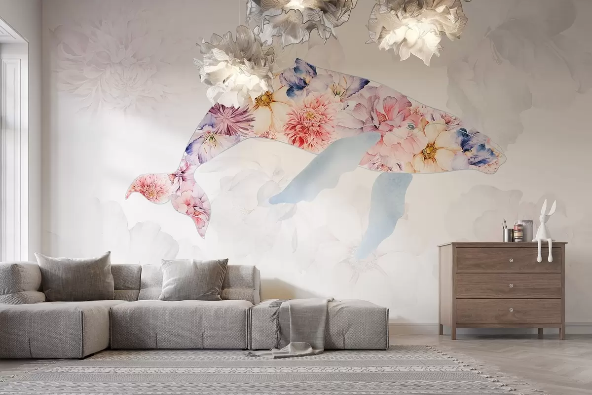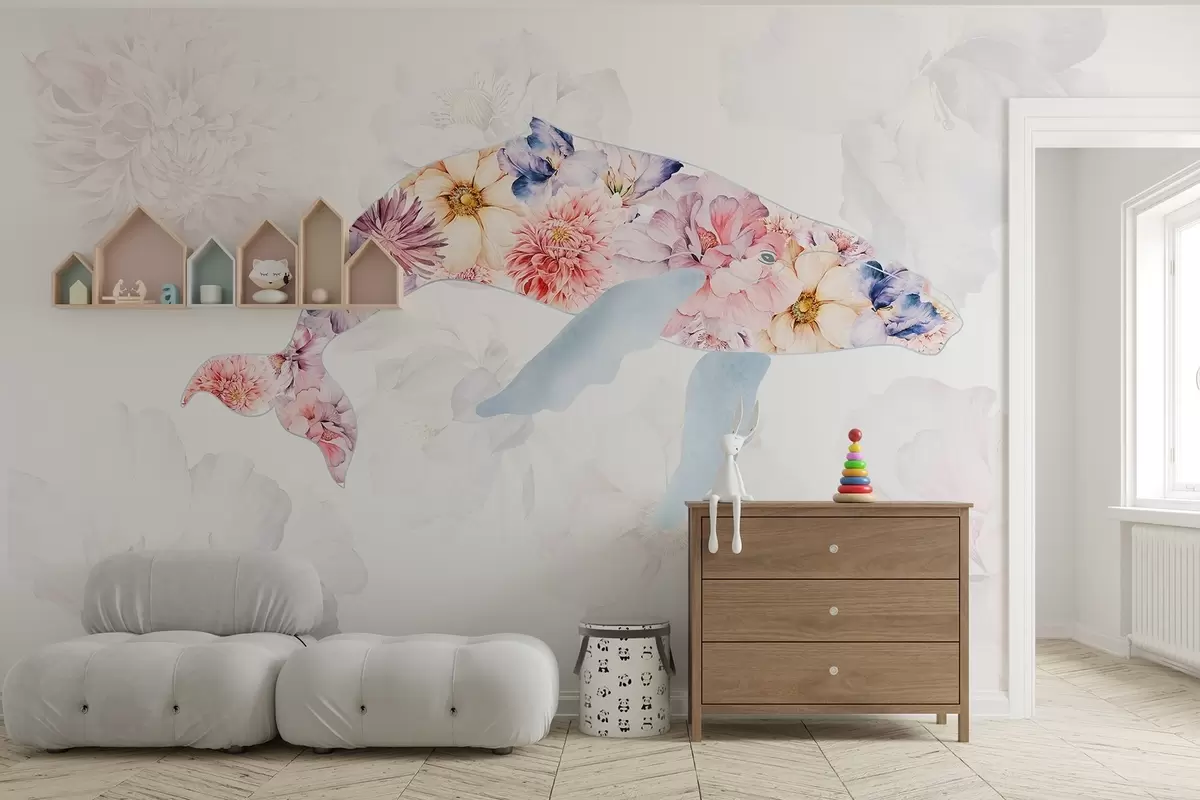 Fototapetes Vaļu ar akvareļu ziedi, okeāna dzīvnieki, minimālisms, krāsains Nr. w03446