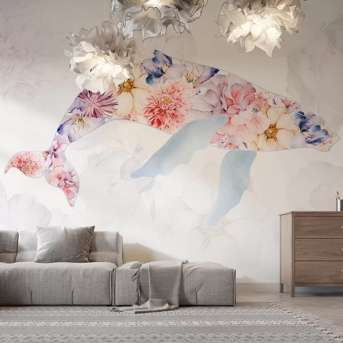 Fototapetes Vaļu ar akvareļu ziedi, okeāna dzīvnieki, minimālisms, krāsains Nr. w03446