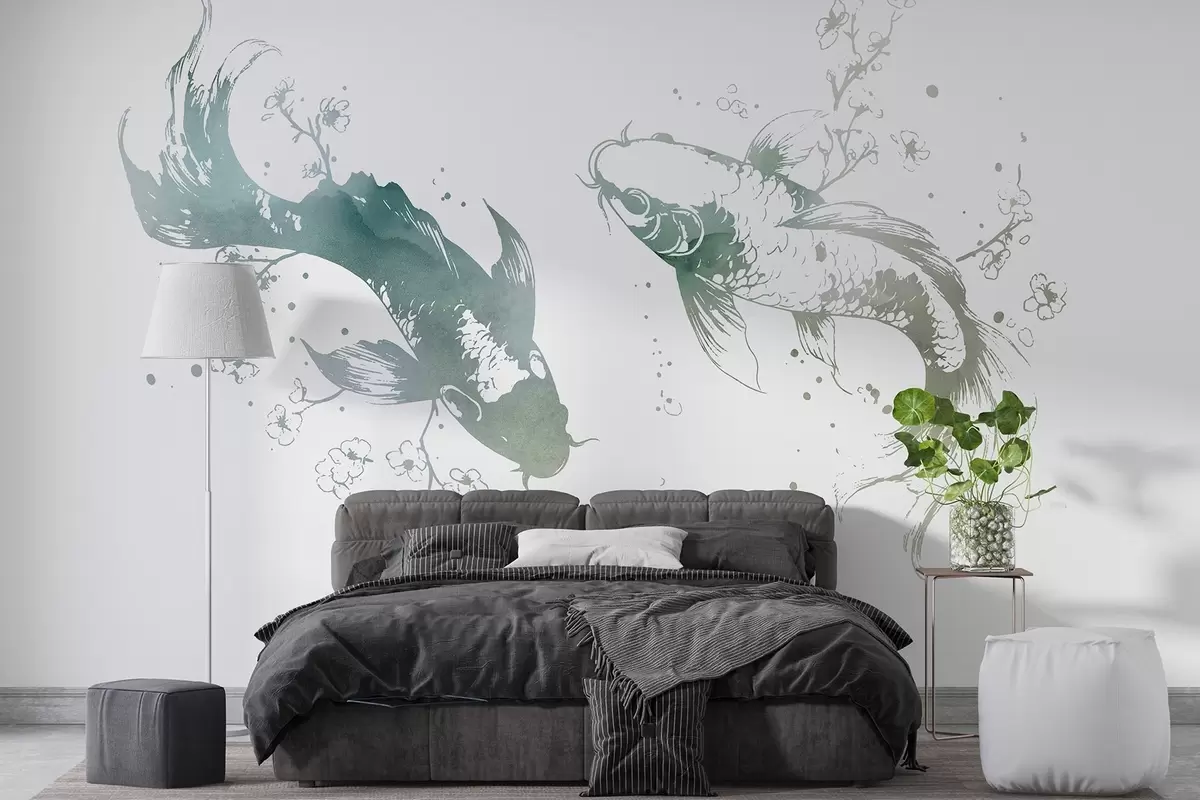 Fototapetes Akvareļu zivis, austrumu stilā, ķiršu koks, zaļas krāsas Nr. w03447v2