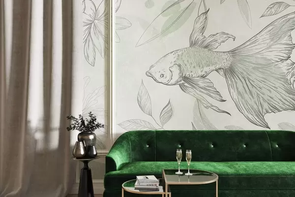 Fototapetes Zivis ar ziedu elementiem, zaļš fons, līniju zīmējums Nr. w03517v1