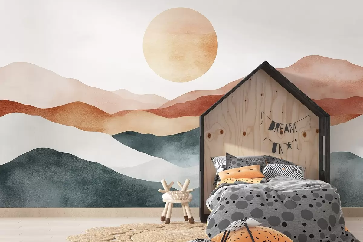 Fototapetes Akvareļkrāsaini kalni ar sauli, boho stils, sarkans, oranžs, pelēks Nr. w03551