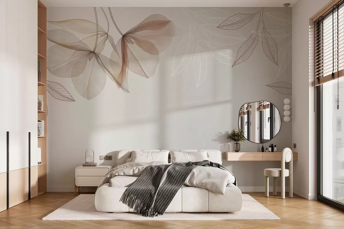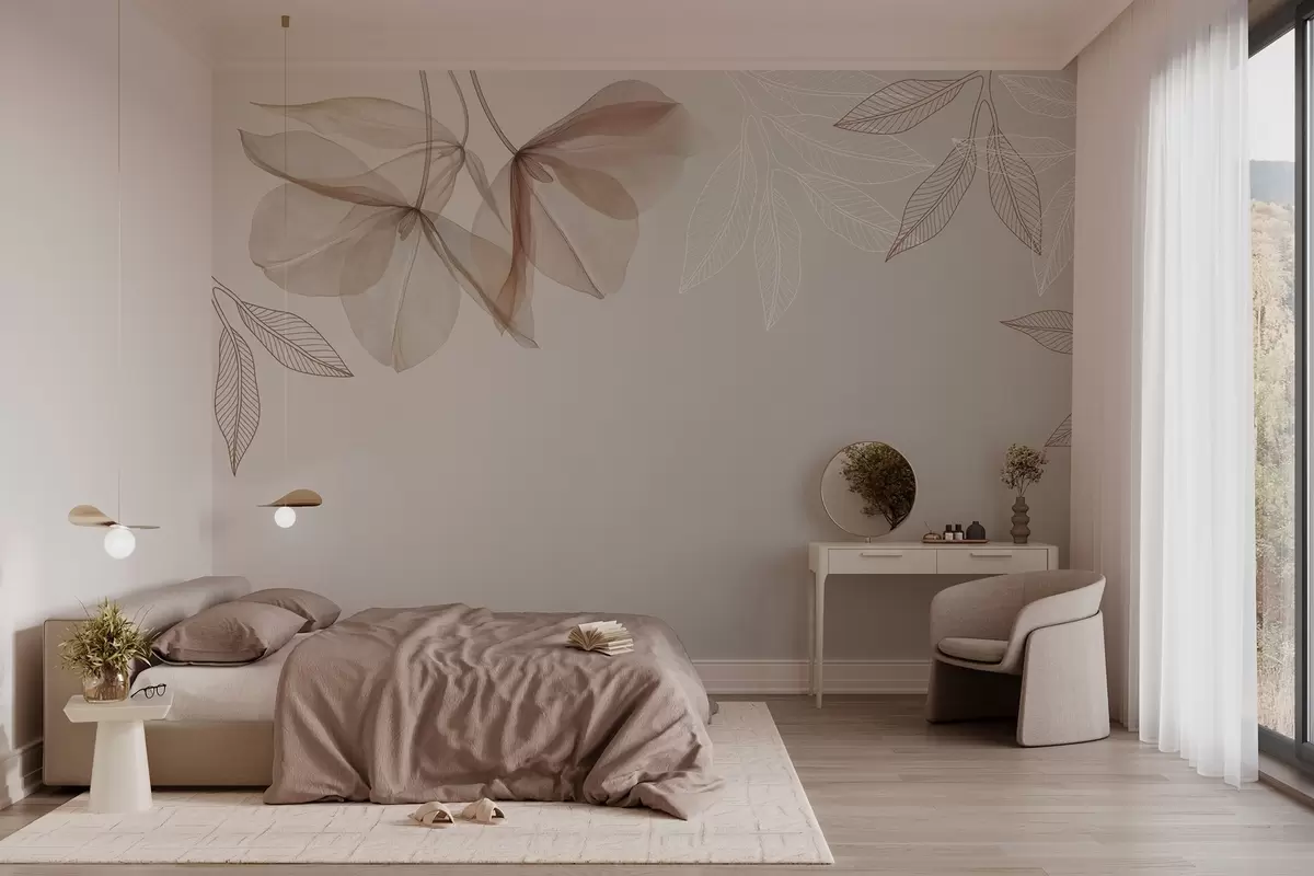 Fototapetes maigi caurspīdīgi ziedi un lapas mokas toņos Nr. w03616v3