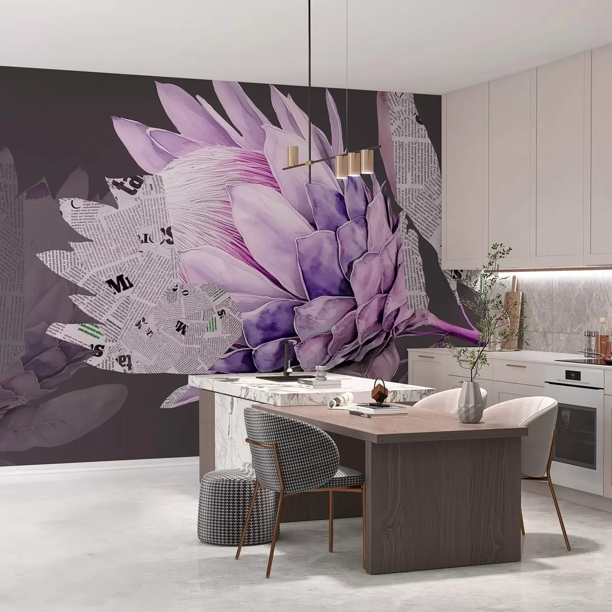 Fototapetes Protea ziedi, avīžu māksla, ziedu, tropu, tumšs fons, violetas krāsas Nr. w03667v2
