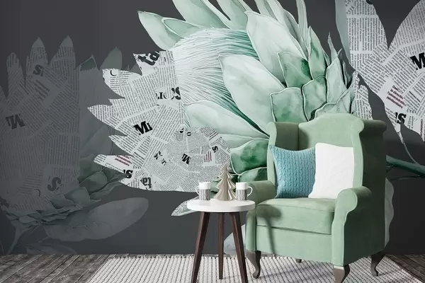 Fototapetes Protea ziedi, avīžu māksla, ziedu, tropu, tumšs fons, zaļas krāsas Nr. w03667v3