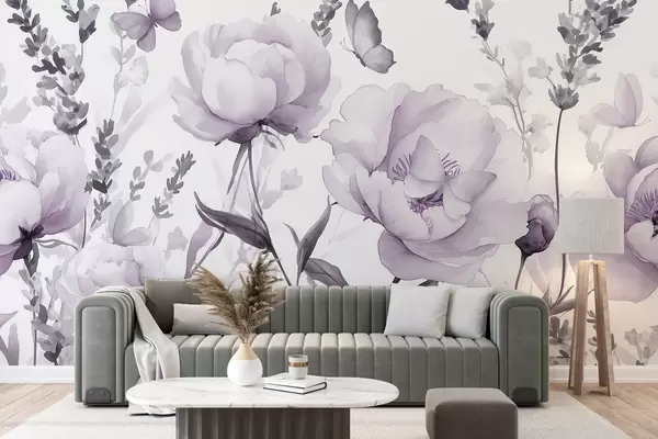 Fototapetes Ziedu pļava, peonijas, lavanda, tauriņi, akvareļu stils, leļļu krāsas Nr. w03668v3