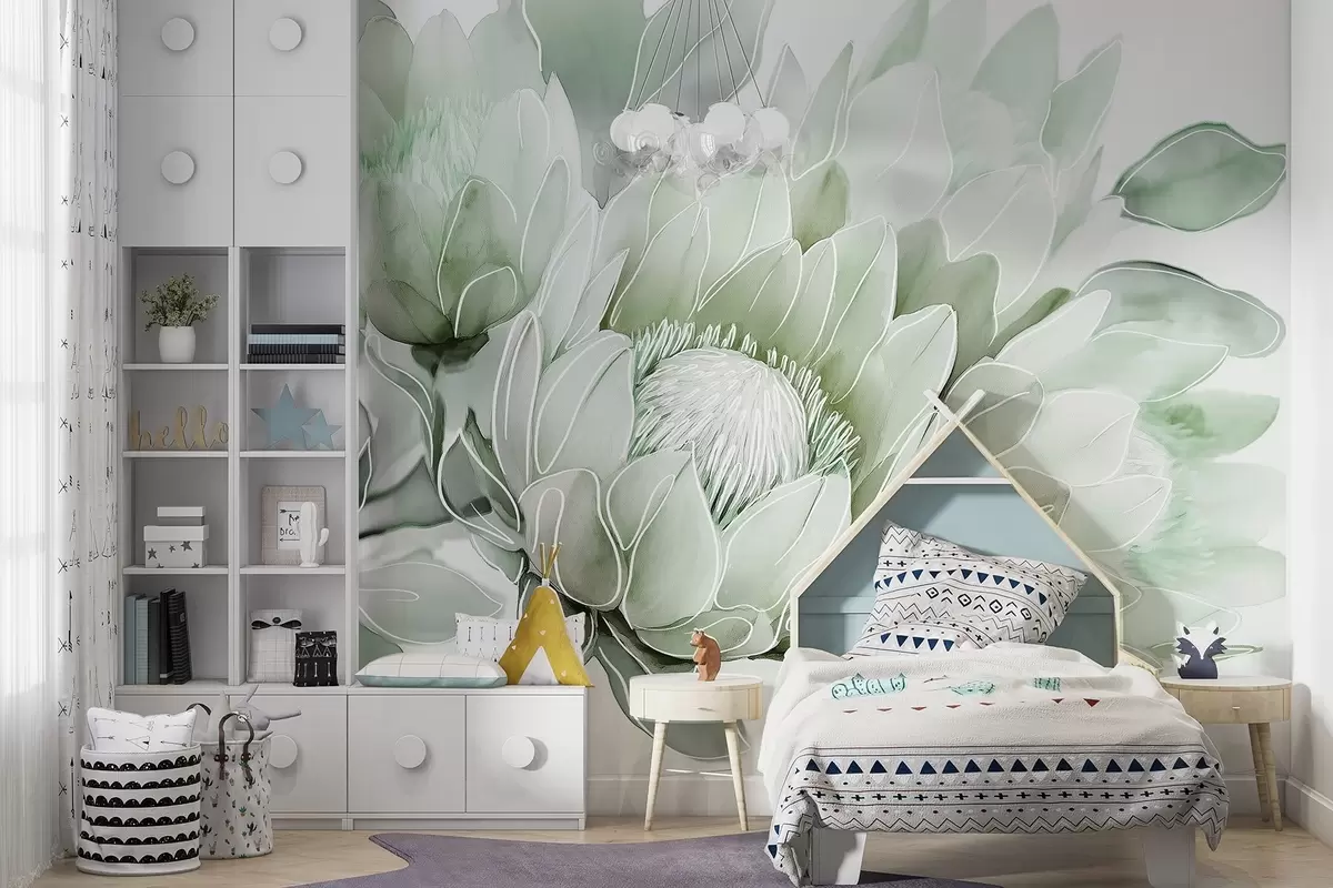 Fototapetes Skaisti protea ziedi, lineārmākslas zīmējums, tropu, zaļas krāsas Nr. w03669v2