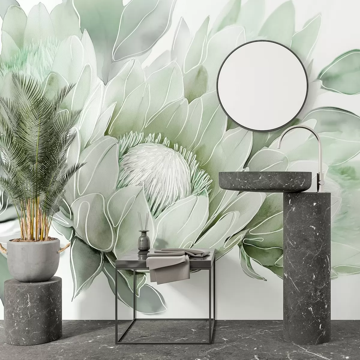 Fototapetes Skaisti protea ziedi, lineārmākslas zīmējums, tropu, zaļas krāsas Nr. w03669v2