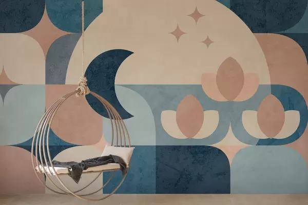Fototapetes ģeometriskā abstrakcija, kurā maigas formas vienmērīgi savijas ar mēness, ziedu un zvaigžņu simboliem. Nr. w03723