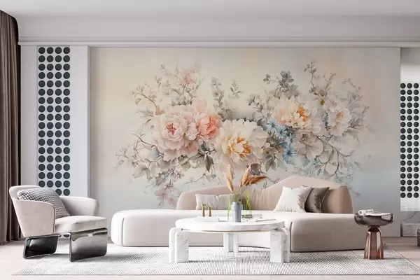 Fototapetes maigi akvareļa stila ziedi pasteļtoņos - rozā, smilškrāsas un zilos toņos Nr. w03724