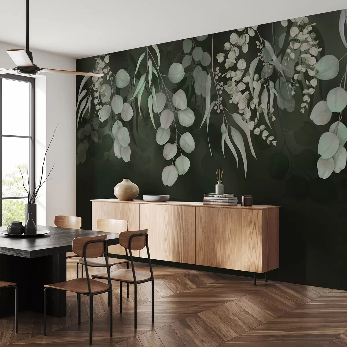 Fototapetes Tropu lapas uz tumši zaļa fona, ziedu Nr. w03752