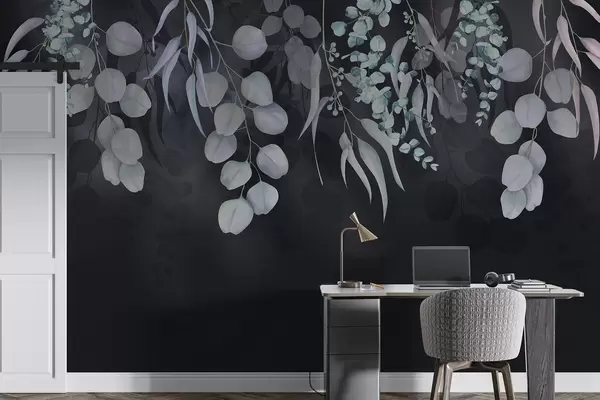 Fototapetes Tropu lapas uz tumši zila fona, ziedu w03752v2