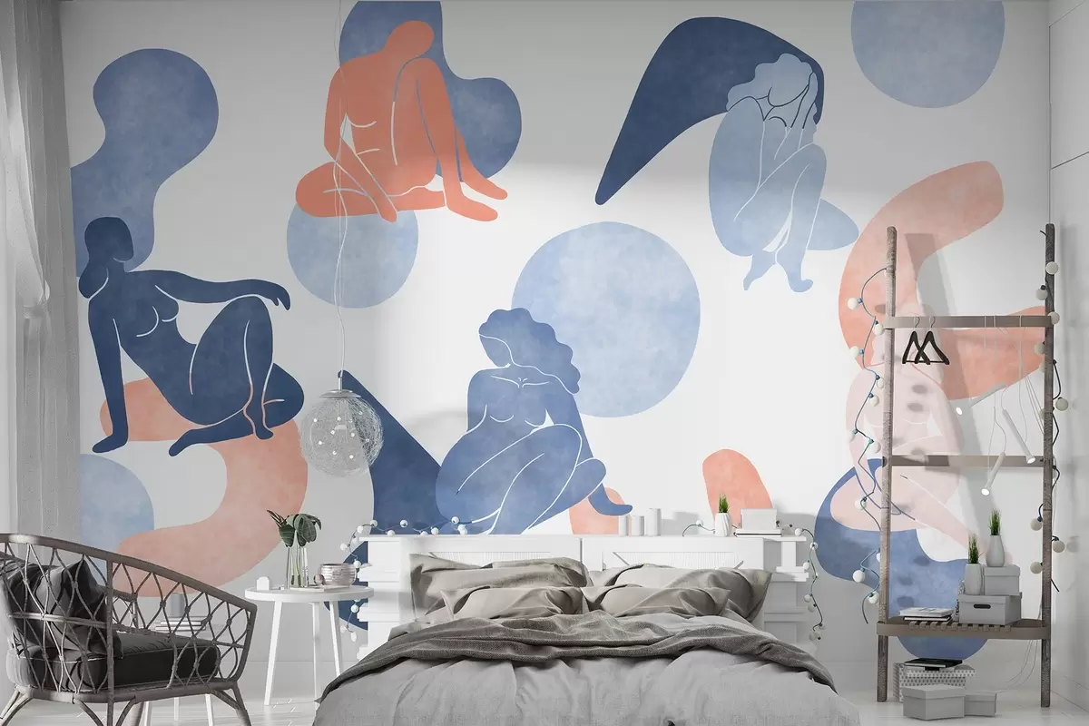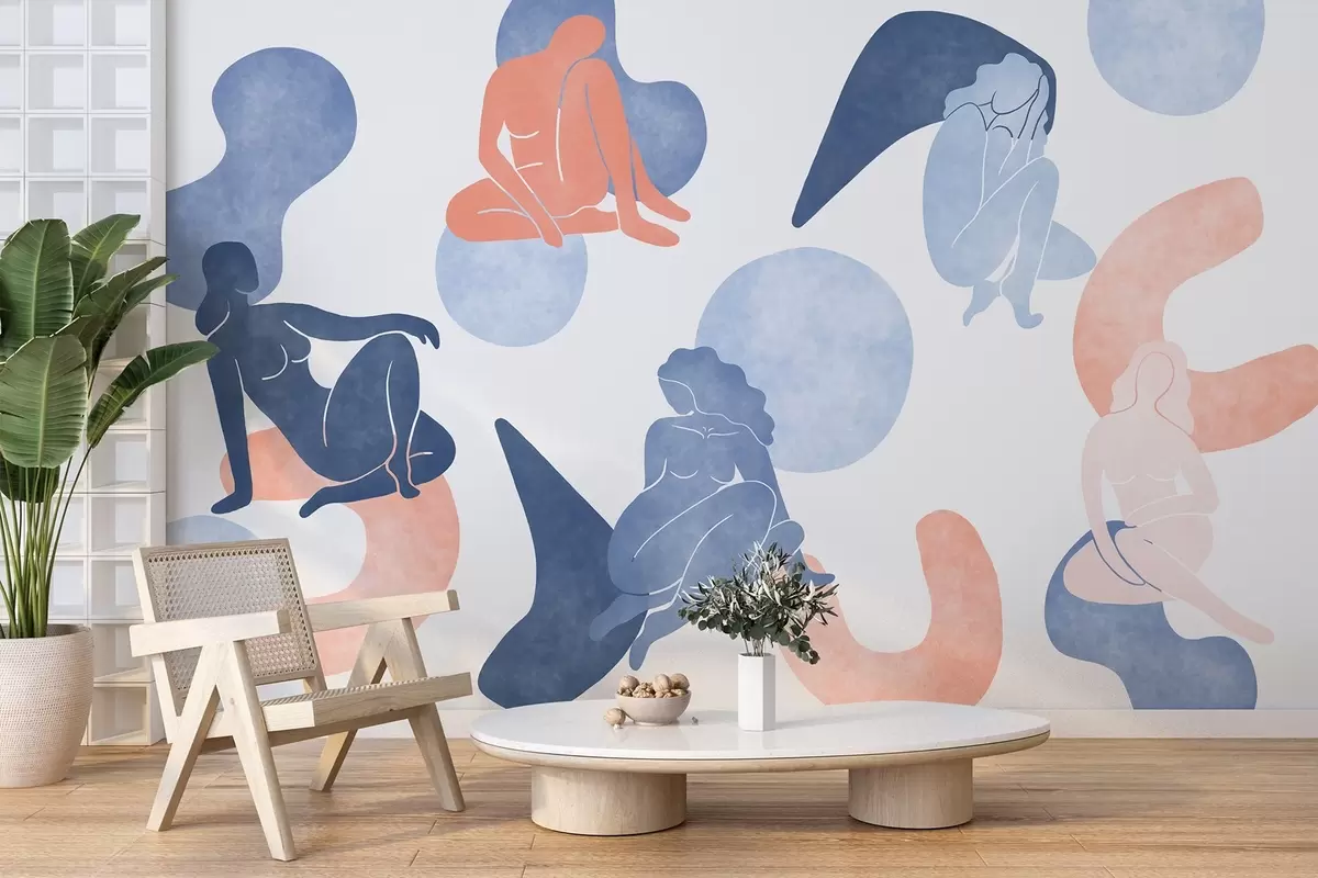 Fototapetes Ģeometriskas abstrakcijas ar sieviešu siluetiem, boho stils, zils, bēšs, rozā Nr. w03753v1