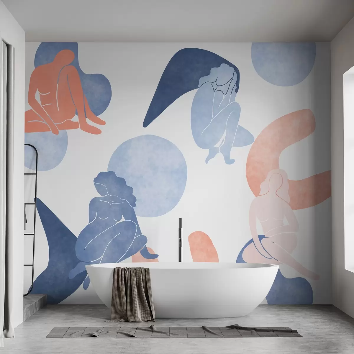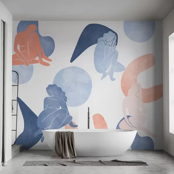 Fototapetes Ģeometriskas abstrakcijas ar sieviešu siluetiem, boho stils, zils, bēšs, rozā Nr. w03753v1
