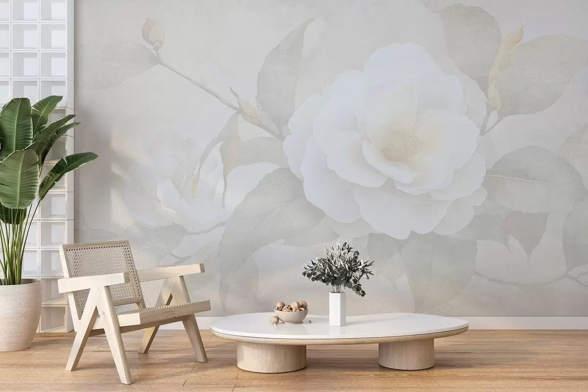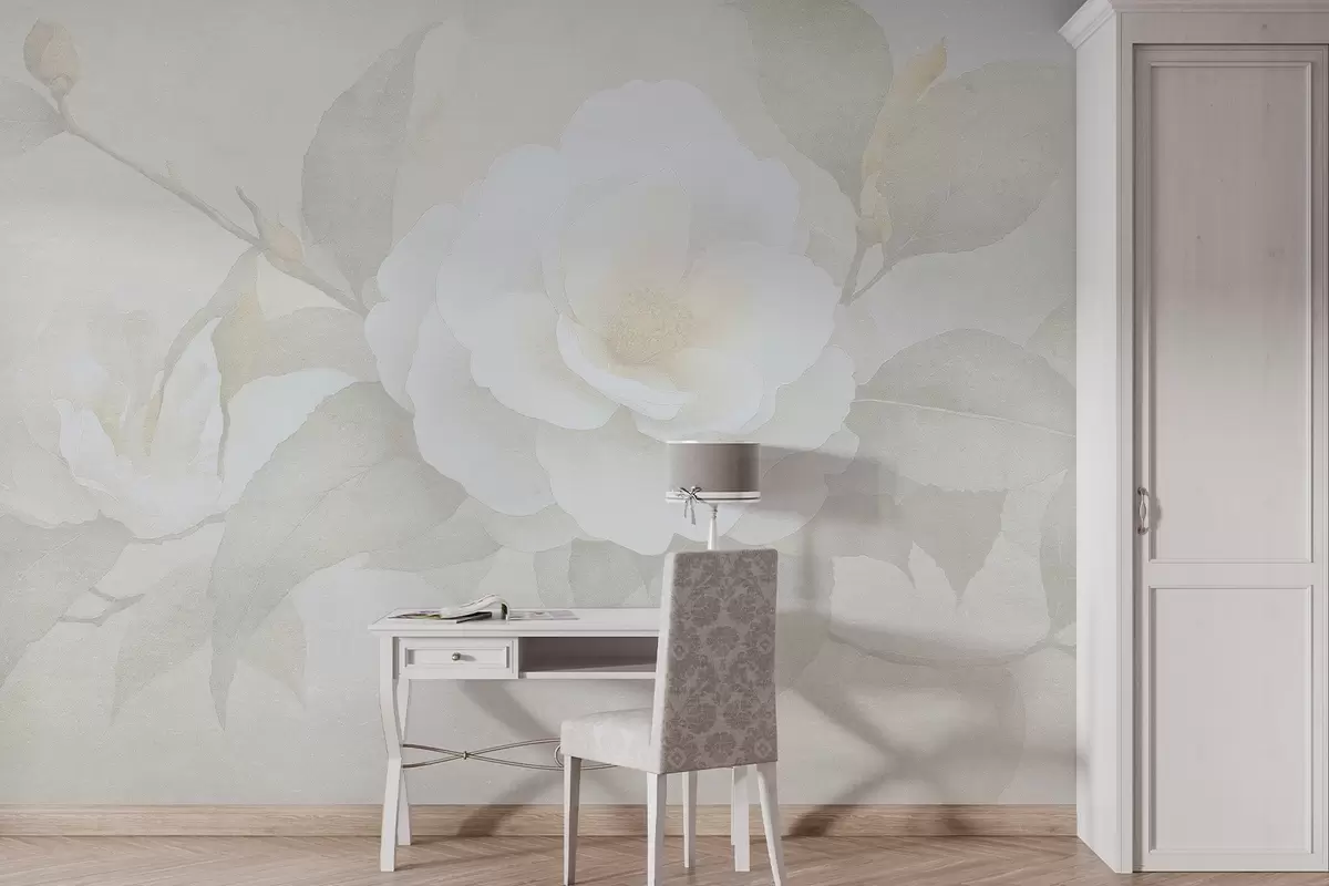 Fototapetes Maigas pasteļtoņi ar kamēlijas ziediem uz zara, smilškrāsas krāsas Nr. w03760