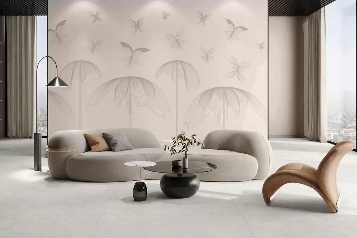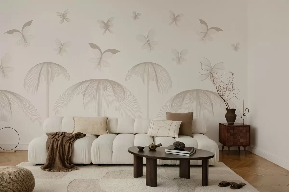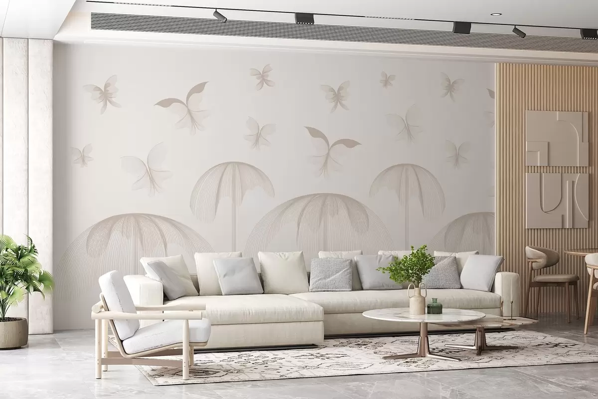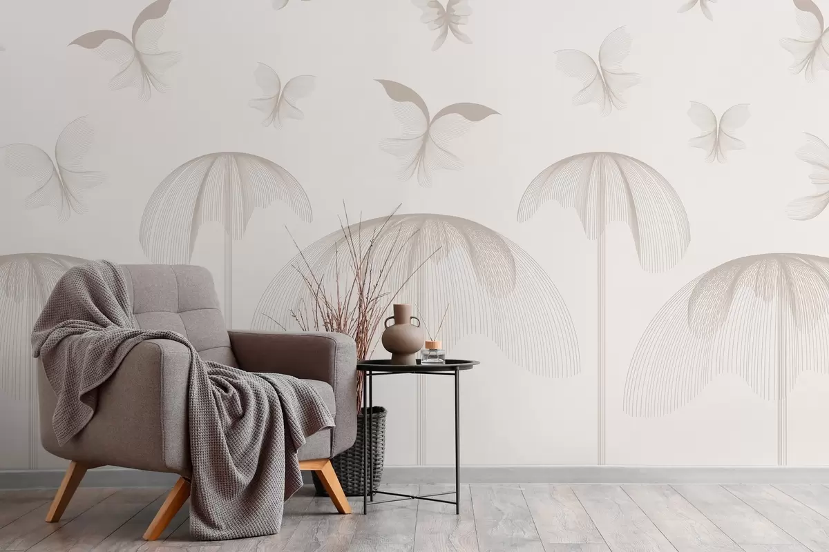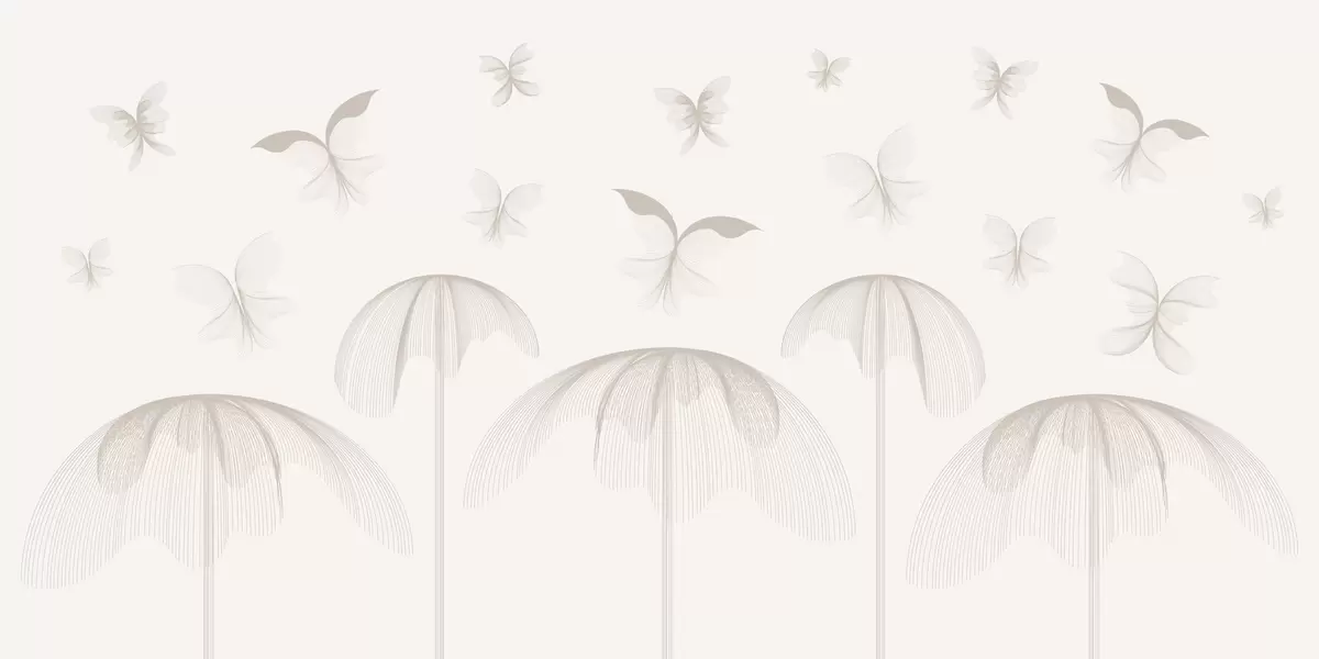 Fototapetes minimālisma lineārs tapetes tauriņi un strūklakas uz piena fona Nr. w03762