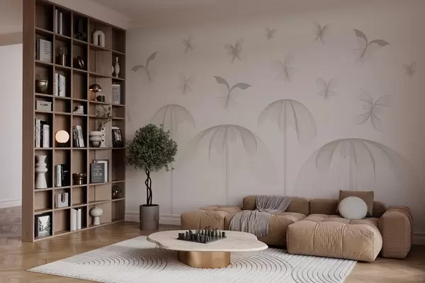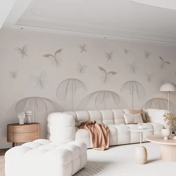Fototapetes minimālisma lineārs tapetes tauriņi un strūklakas uz piena fona Nr. w03762