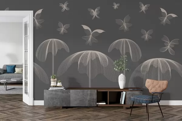 Fototapetes minimālisma lineārs tapetes tauriņi un strūklakas uz tumši pelēka fona Nr. w03762v1