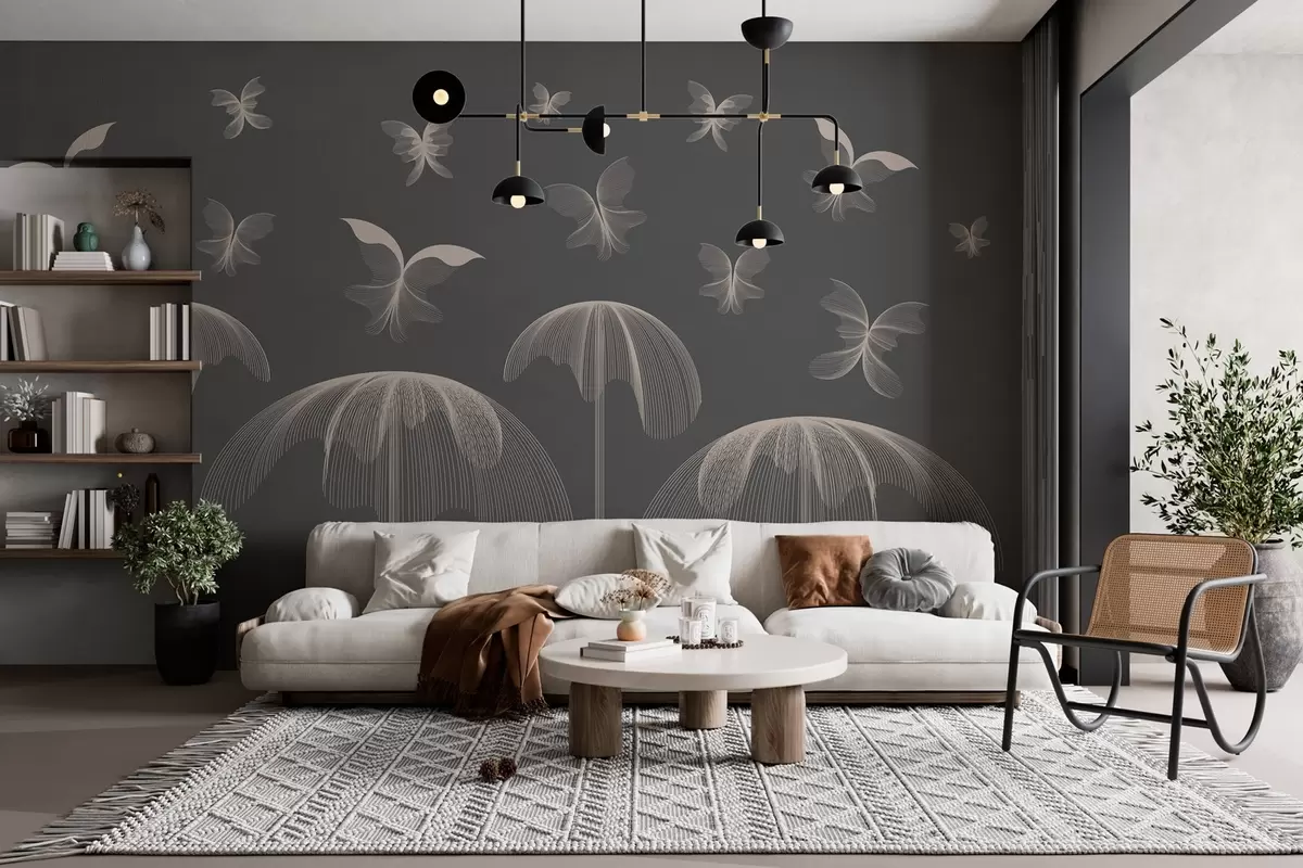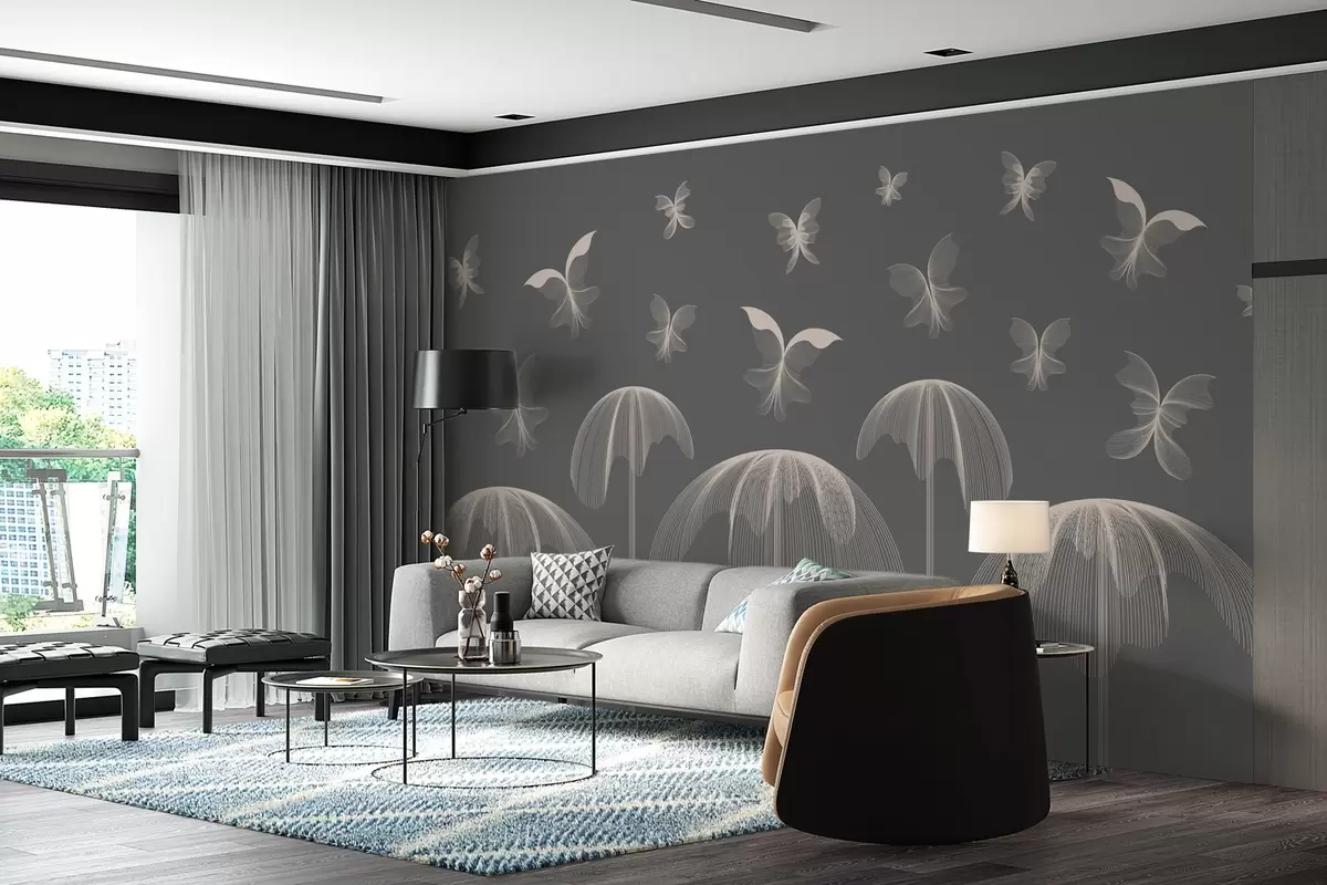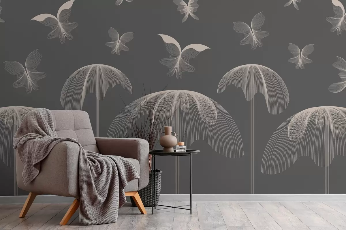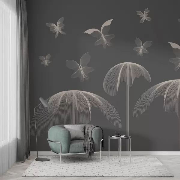 Fototapetes minimālisma lineārs tapetes tauriņi un strūklakas uz tumši pelēka fona Nr. w03762v1