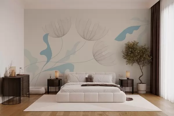 Fototapetes eleganti minimālisma stila ziedi gaiši zilos toņos uz bēša fona Nr. w03763v1