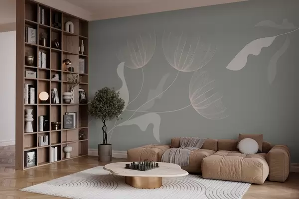 Fototapetes eleganti minimālisma stila ziedi zaļos toņos uz bēša fona Nr. w03763v2