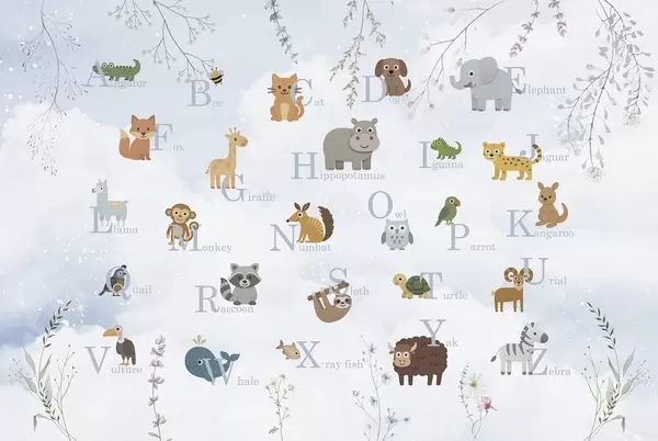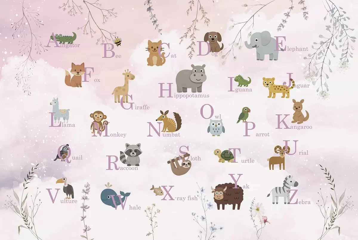 Fototapetes Alfabēts ar rozā burtiem, augiem un debesīm Nr. w03809