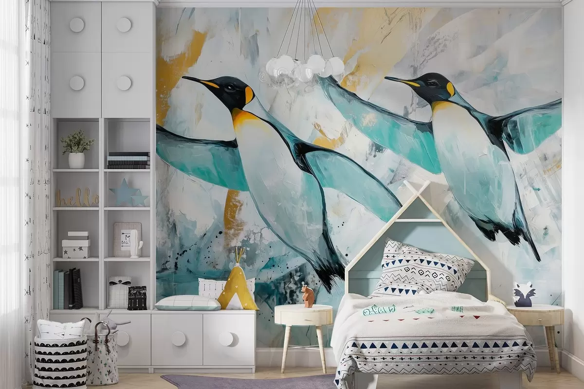 Fototapetes Gudri pingvīni, Antarktika, zilais ledus, dzīvnieki, eļļas stila zīmējums Nr. w03883