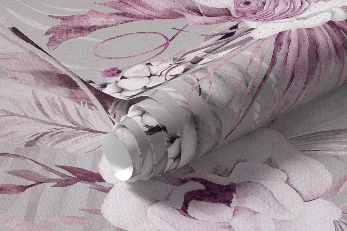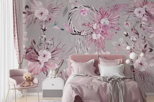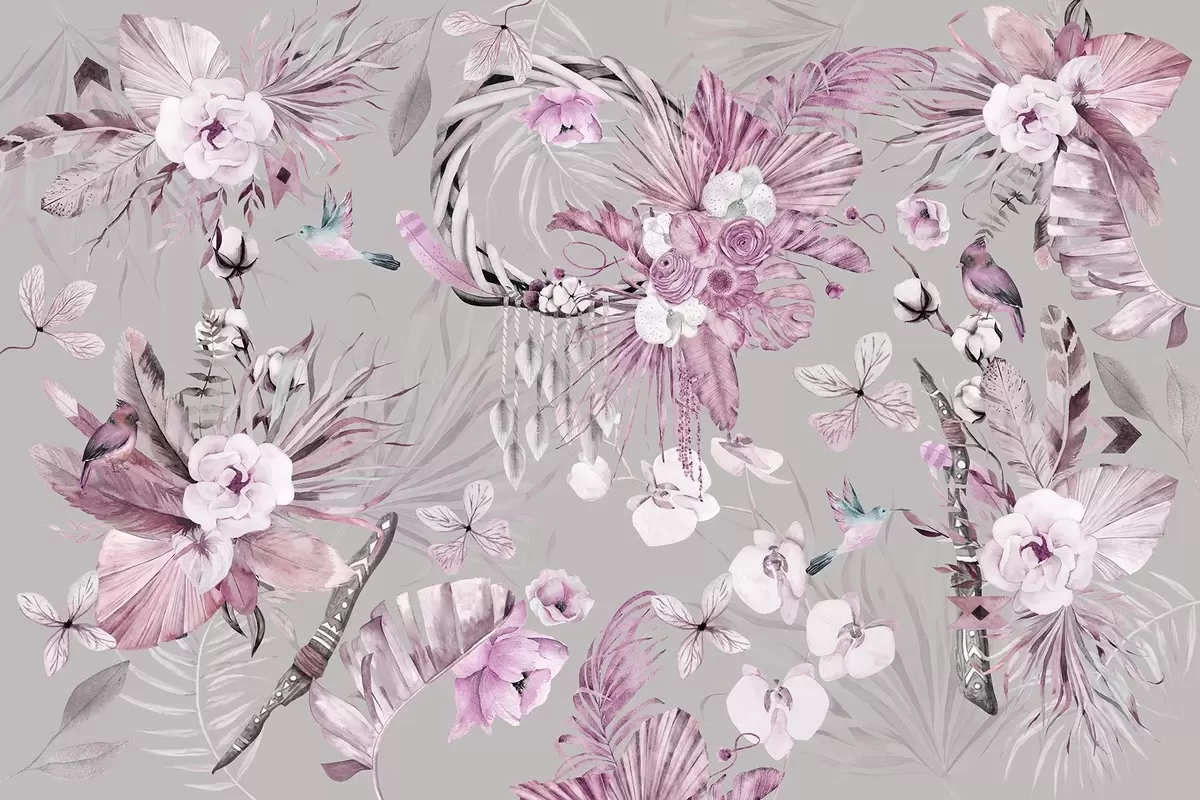 Fototapetes Boho stila ornaments ar peoniju ziediem un putniem, akvareļu stilā, rozā krāsās Nr. w03885v1