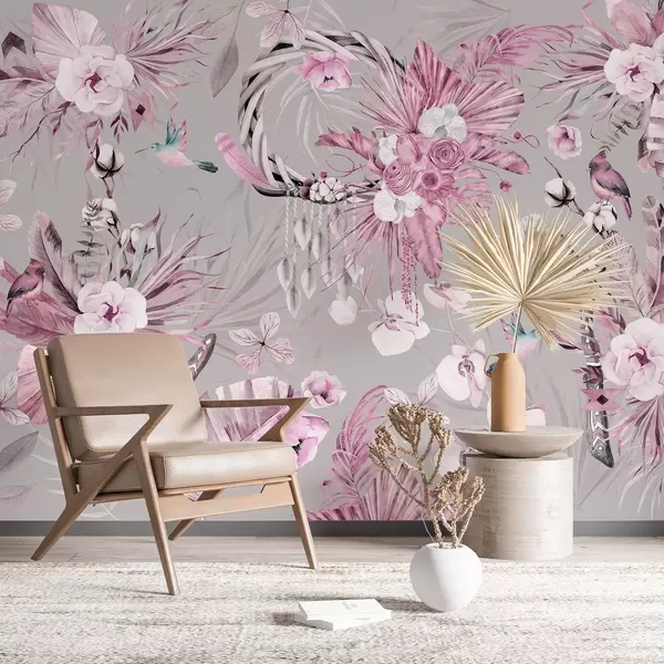 Fototapetes Boho stila ornaments ar peoniju ziediem un putniem, akvareļu stilā, rozā krāsās Nr. w03885v1