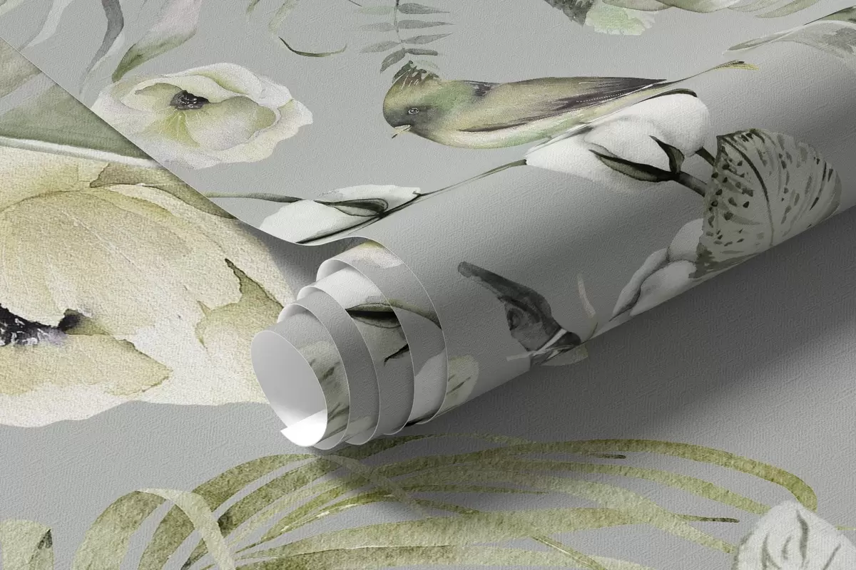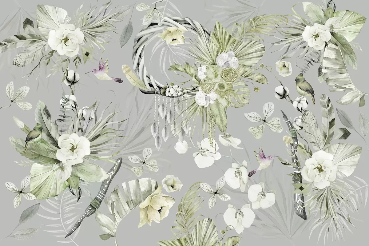 Fototapetes Boho stila ornaments ar peoniju ziediem un putniem, akvareļu stilā, zaļā krāsā Nr. w03885v2