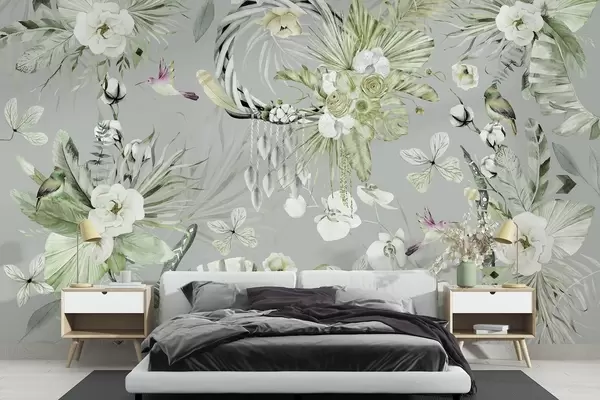 Fototapetes Boho stila ornaments ar peoniju ziediem un putniem, akvareļu stilā, zaļā krāsā Nr. w03885v2