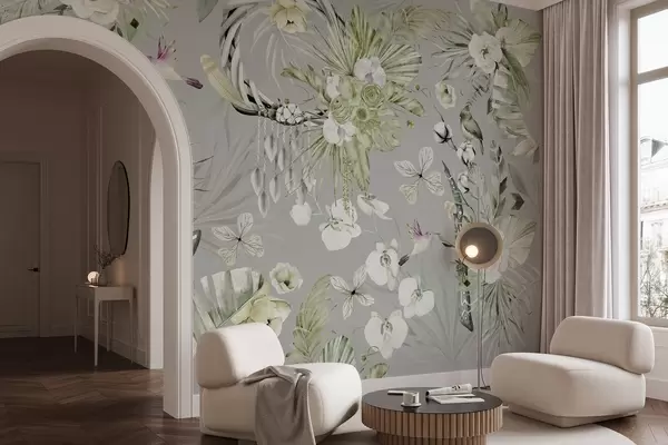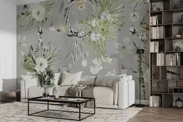 Fototapetes Boho stila ornaments ar peoniju ziediem un putniem, akvareļu stilā, zaļā krāsā Nr. w03885v2