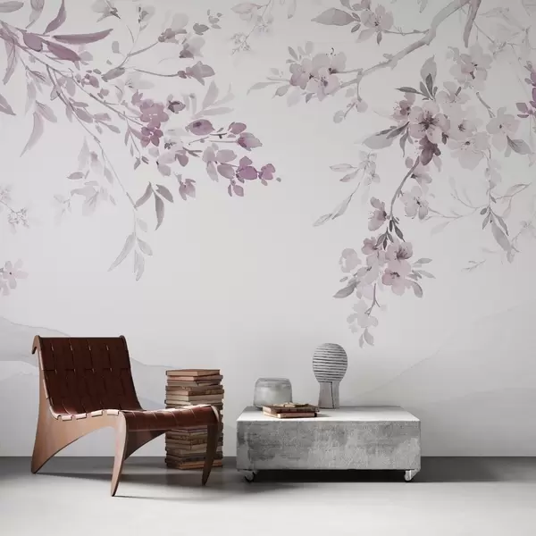 Fototapetes Ziedēšanas zari, akvareļu imitācija, violeti rozā toņos Nr. w03935v1