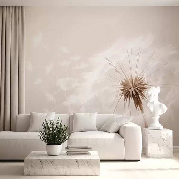 Fototapetes Mūsdienīga maiga ziedu kompozīcija ar pilnībā uzziedējušu pieneņu galviņu un peldošām sēklām uz maigas tekstilmateriāla tekstūras Nr. w03939