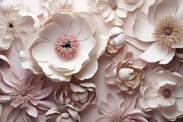 Fototapetes Apjomīga ziedu kompozīcija ar maigiem papīra vai tekstila iedvesmotiem ziedlapiņām ziloņkaula, vaniļas un sārtos toņos uz silta smilškrāsas audekla. Nr. w03945v1