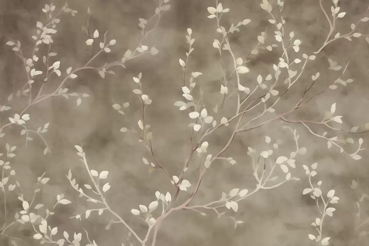 Fototapetes minimālisma stilā ar rokām apgleznotas tapetes ar maigi baltiem koku zariem un maigām lapām, kas organiski sazarojas pāri pieklusinātam salvijas zaļajam fonam, smalks botānisks līniju raksts dabiskā plūdumā Nr. w03949v1