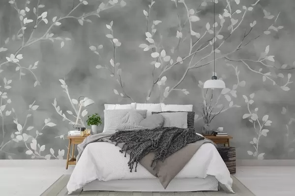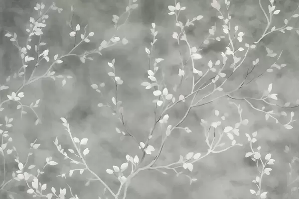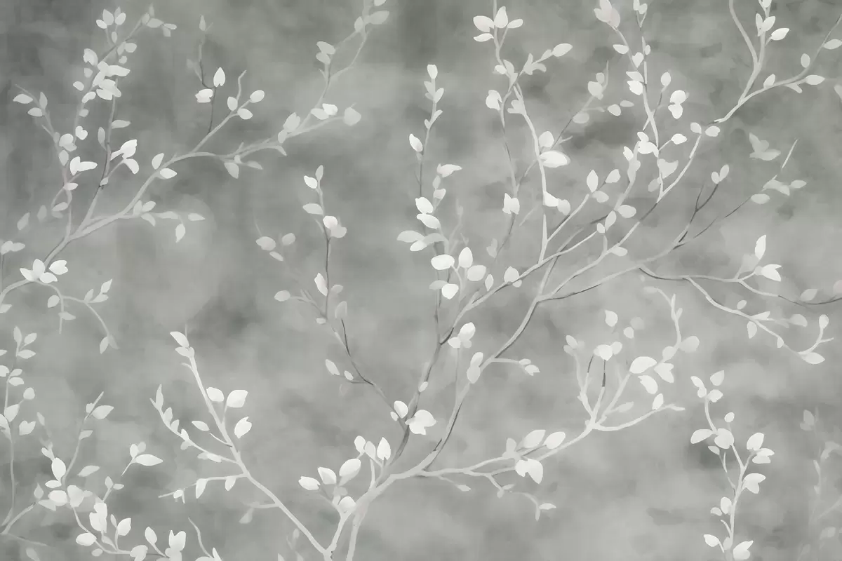 Fototapetes minimālisma stilā ar rokām apgleznotas tapetes ar maigi baltiem koku zariem un maigām lapām, kas organiski sazarojas pāri pieklusinātam salvijas zaļajam fonam, smalks botānisks līniju raksts dabiskā plūdumā Nr. w03949v2