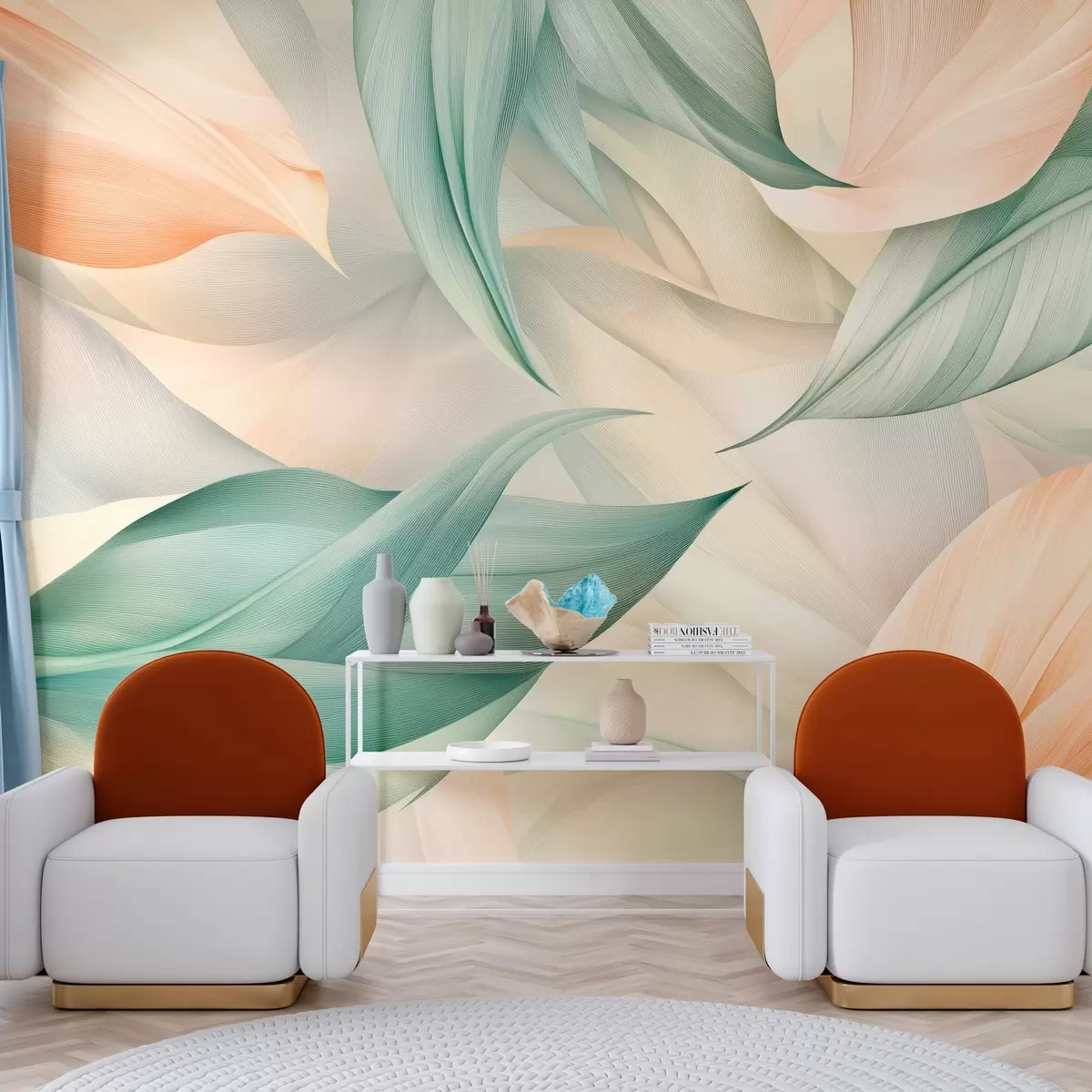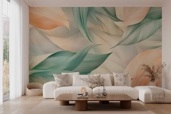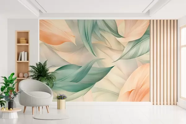 Fototapetes eksotiskas tropu lapas maigos persiku un zaļos toņos Nr. w03962