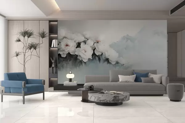 Fototapetes gleznainas sulīgi baltas peonijas uz miglainu kalnu fona Nr. w03965