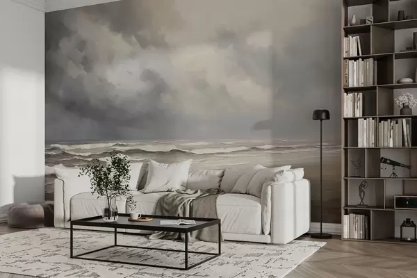 Fototapetes Jūra lietū, pelēki un bēši toņi, atmosfēras kompozīcija Nr. w03998