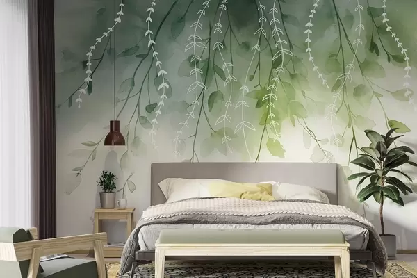 Fototapetes Zari ar lapām akvareļu stilā, dabiski zaļā krāsā Nr. w04007