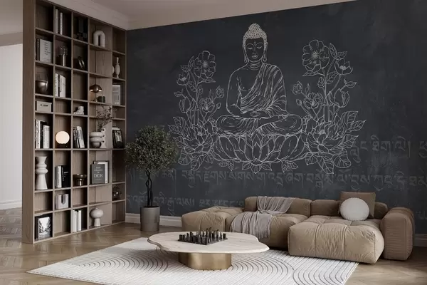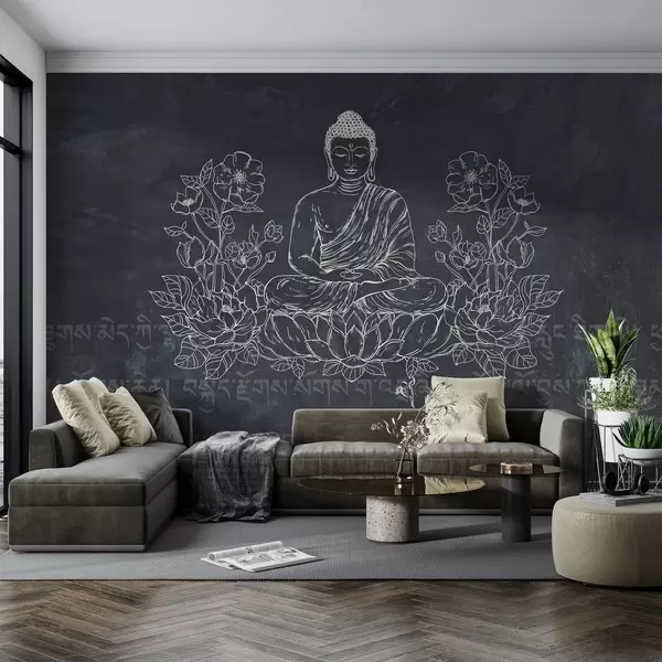 Fototapetes Meditējošs Buda ar lotosa ziediem, line art, austrumu, tumšs fons Nr. w04008