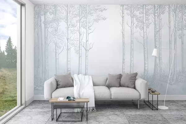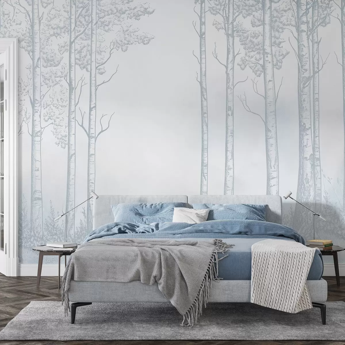 Fototapetes Mežs ar bērziem, minimālisms, daba, zila krāsu palete Nr. w04009