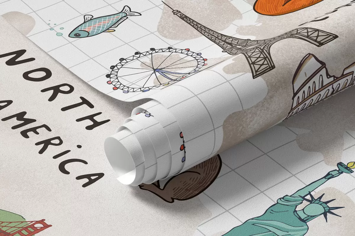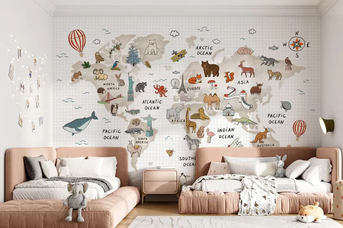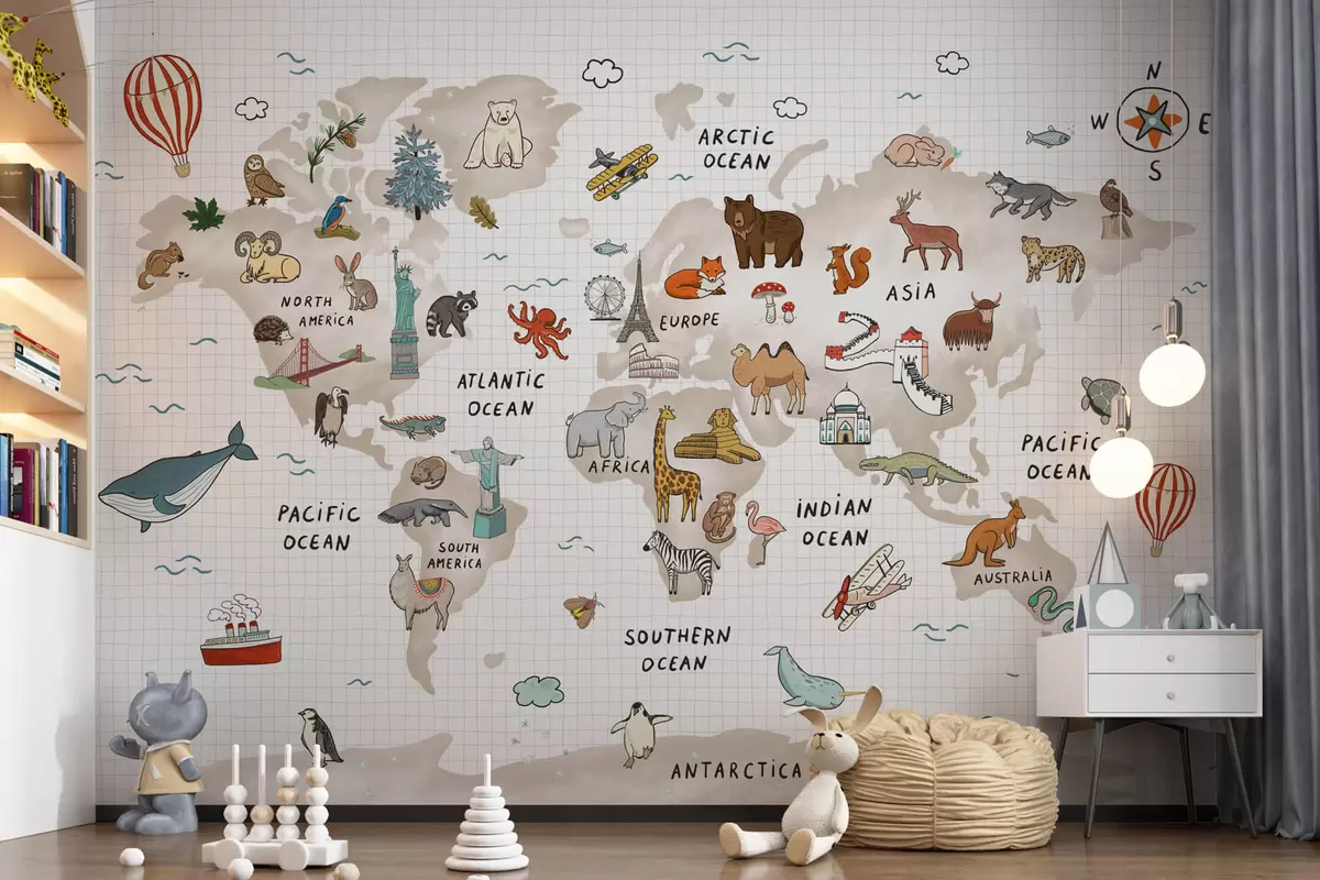 Fototapetes Pasaules karte ar dzīvniekiem un orientieriem Nr. w04011