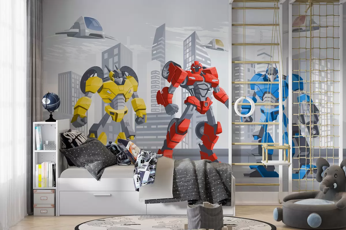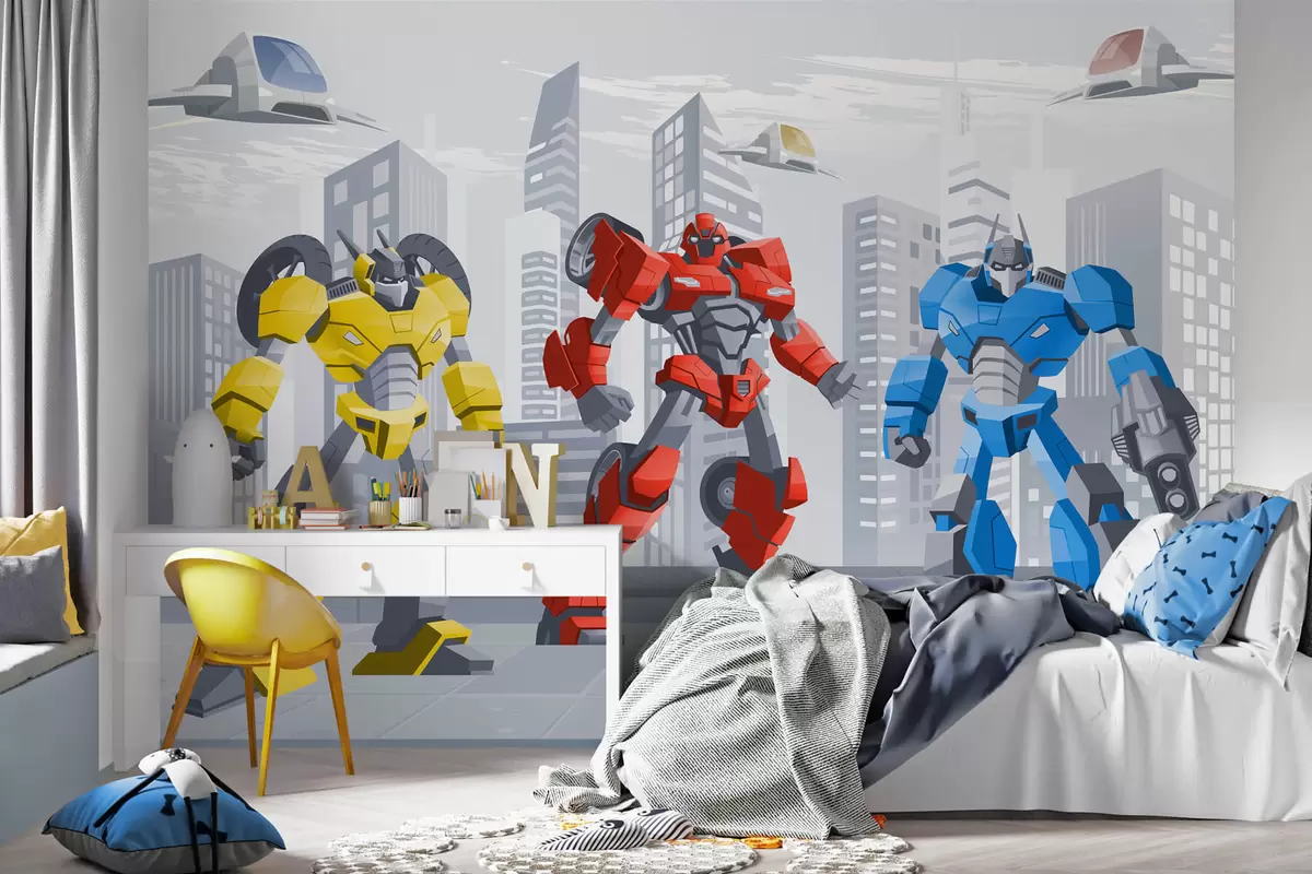 Fototapetes Transformatoru roboti uz melnbaltās pilsētas fona Nr. w04012