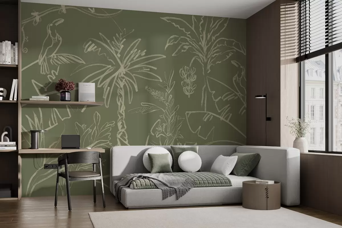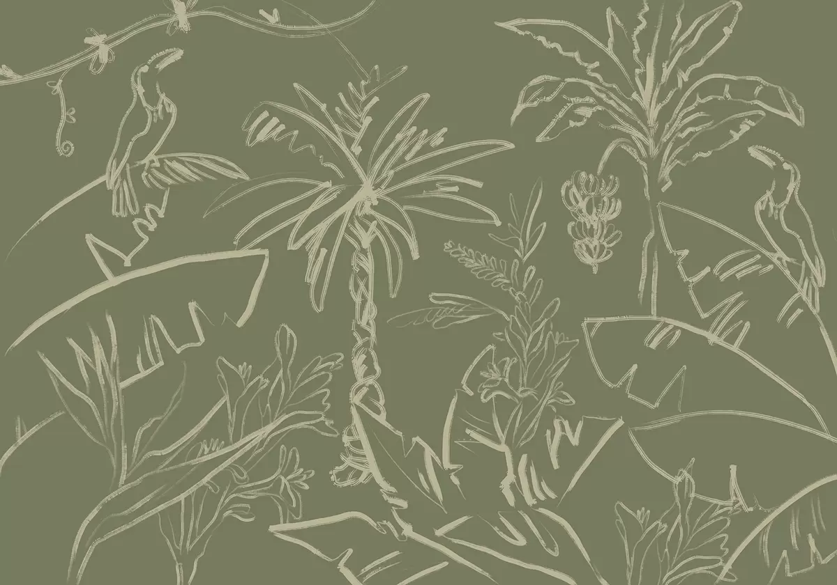 Fototapetes Tropu raksts uz zaļa fona, palmas, banāni Nr. w04020v6
