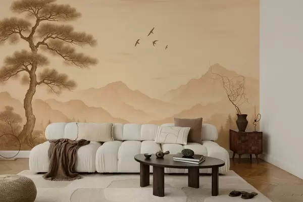 Fototapetes kalnu panorāma ar lielu koku sepijas stilā Nr. w04033