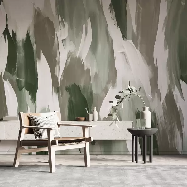 Fototapetes Abstrakta kompozīcija ar otas triepieniem, kas ieturēta zemes zaļā, sārtā un ziloņkaula krāsā un atgādina dabas iedvesmotu, piezemētu ritmu Nr. w04035v1